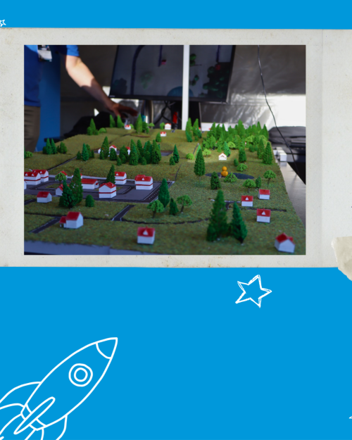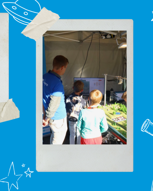 Die Besucher:innen konnten hier erleben, wie mit einem Satellit Daten erfasst und klassifiziert werden. Der Modellbau besteht aus einer detailreichen Mini-Landschaft mit Häusern, Straßen, Bäumen, Wiesen und Seen. Darüber "schwebt" ein kleiner Satellit mit Kamera, der mit einem PC verbunden ist. Auf dem Bildschirm wurde sichtbar, was der Satellit "sieht". Über ein Touchpad konnten die Gäste beispielsweise Wasserflächen, Straßen oder Häuser anklicken - und die Objekte wurden automatisch mithilfe von KI klassifiziert.