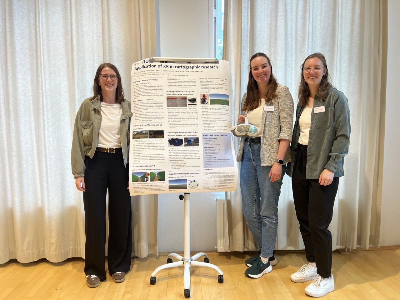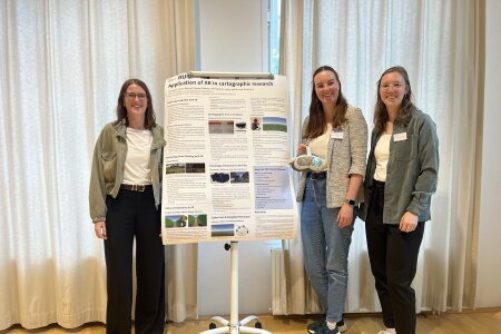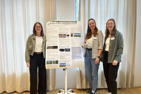 Unsere drei Doktorandinnen präsentierten ein Poster zur Anwendung von XR in kartographischen Studien und zeigten Demos ihrer Experimente, bei denen Teilnehmende sowohl eine VR- als auch eine monitorbasierte Navigationsaufgabe ausprobieren konnten.