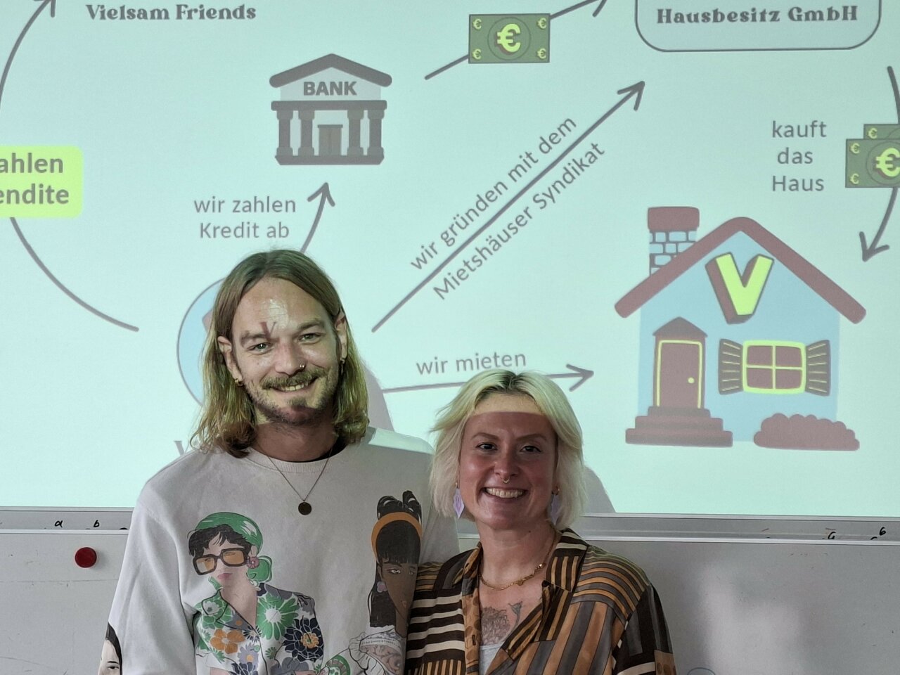Vera Recktenwald und Thomas Nohn stellten diesen Ansatz im Masterkurs „Gemeinwohlorientierte Stadtentwicklung“ vor und zur Diskussion. Verbunden werden in dem Wohnprojekt die Interessen der acht Einzelpersonen (Gemeinschaft in der „Wahlfamilie“, nachhaltigeres Leben mit weniger Ressourcenverbrauch als in Einzelwohnungen, günstigeres Wohnen durch geteilte Kosten) mit dem Ansatz, Boden und Wohnraum dauerhaft dem Markt zu entziehen. Mit Hilfe des Mietshäuser Syndikats hofft das Team ein Haus zu kaufen und über seine eigene Wohn- und Lebenszeit hinaus Wohngemeinschaften als günstigen Lebensraum zur Verfügung stellen zu können. Es soll zudem ein Ort werden, der einen Safe Space für unterschiedlichste Personengruppen, eine Anlaufstelle für die Nachbarschaft, einen kreativen Raum mit Werkstätten und Atelier sowie Veranstaltungen und Stadtteilarbeit bietet.
