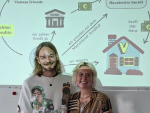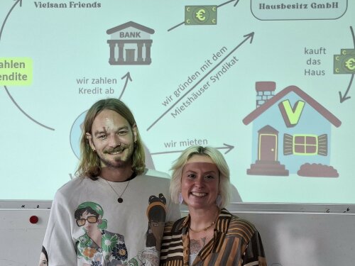 Den Studierenden wurde so das Konzept das Mietshäuser Syndikats, das mit einer solidarischen Finanzierung arbeitet, vorgestellt. Ein für das Wohnprojekt gegründeter Verein (Vielsam e.V.) und das Mietshäuser Syndikat gründen gemeinsam eine GmBH, die die ausgewählte Immobilie erwirbt. Die Bewohner:innen zahlen dann später eine Miete, die lediglich der Rückzahlung der Kredite, dem Unterhalt des Hauses und einem Solidarbeitrag für das Mietshaus Syndikat dient. So wird eine renditeorientierte Nutzung verhindert, die Mieten bleiben stabil und langfristig kalkulierbar. Deutlich wurden die Probleme bzgl. Kommunikation, Moderation und Finanzierung: derzeit stellt die Suche nach Geber:innen von Direktkrediten die größte Herausforderung dar. Details zum Projekt „Vielsam“ finden sich hier.