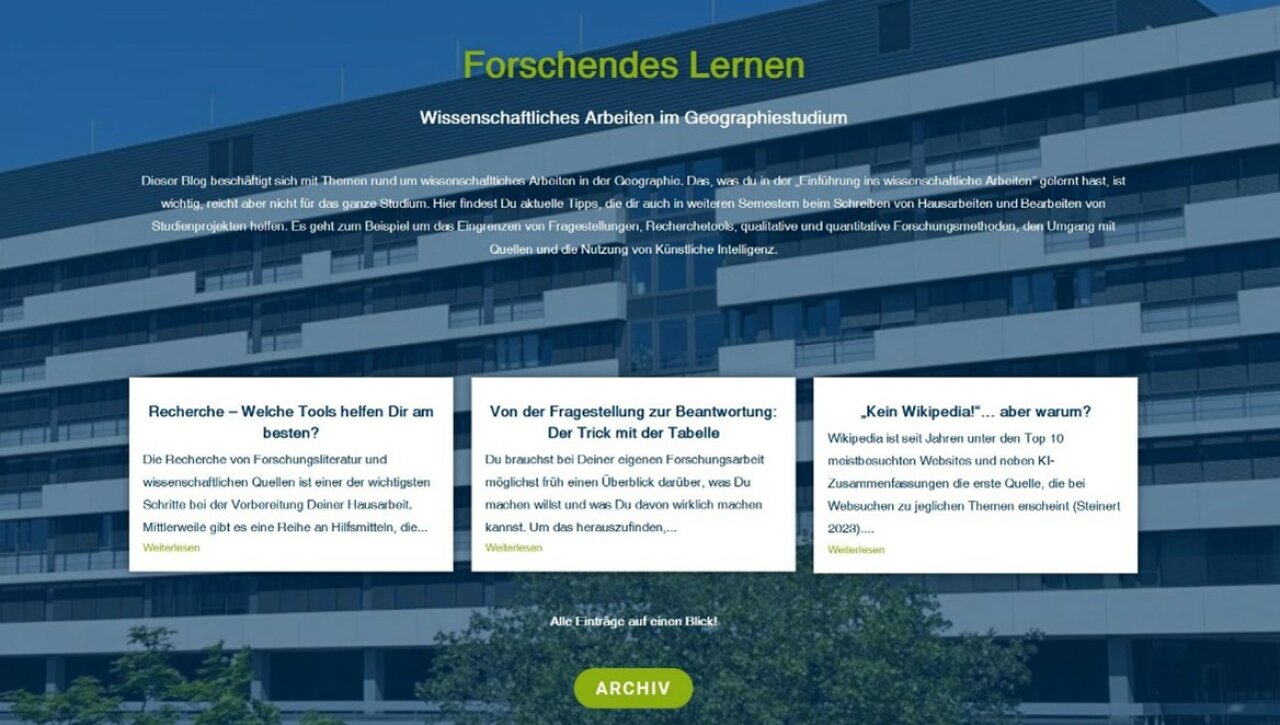 Du brauchst Hilfe beim Strukturieren deiner Hausarbeit oder bist nicht zufrieden mit deinen Rechercheergebnissen? Die „Einführung ins wissenschaftliche Arbeiten“ bietet zwar einen guten Einstieg für Studierende der Geographie, sie allein bringt euch jedoch nicht durch das gesamte Studium. Unser neuer Blog Forschendes Lernen knüpft daran an, indem Themen rund ums wissenschaftliche Arbeiten vertieft werden und Studierende auch in fortgeschrittenen Semestern Tipps und Tricks zum Schreiben von Hausarbeiten und zur Bearbeitung von Studienprojekten erhalten. In den bisher veröffentlichen Beiträge geht es z. B. um KI-basierter Literaturrecherche, die systematische Beantwortung von Forschungsfragen oder die Risiken bei der Nutzung wissenschaftlich ungeeigneter Quellen wie KI-Zusammenfassungen und Wikipedia. Ihr findet den Blog hier.